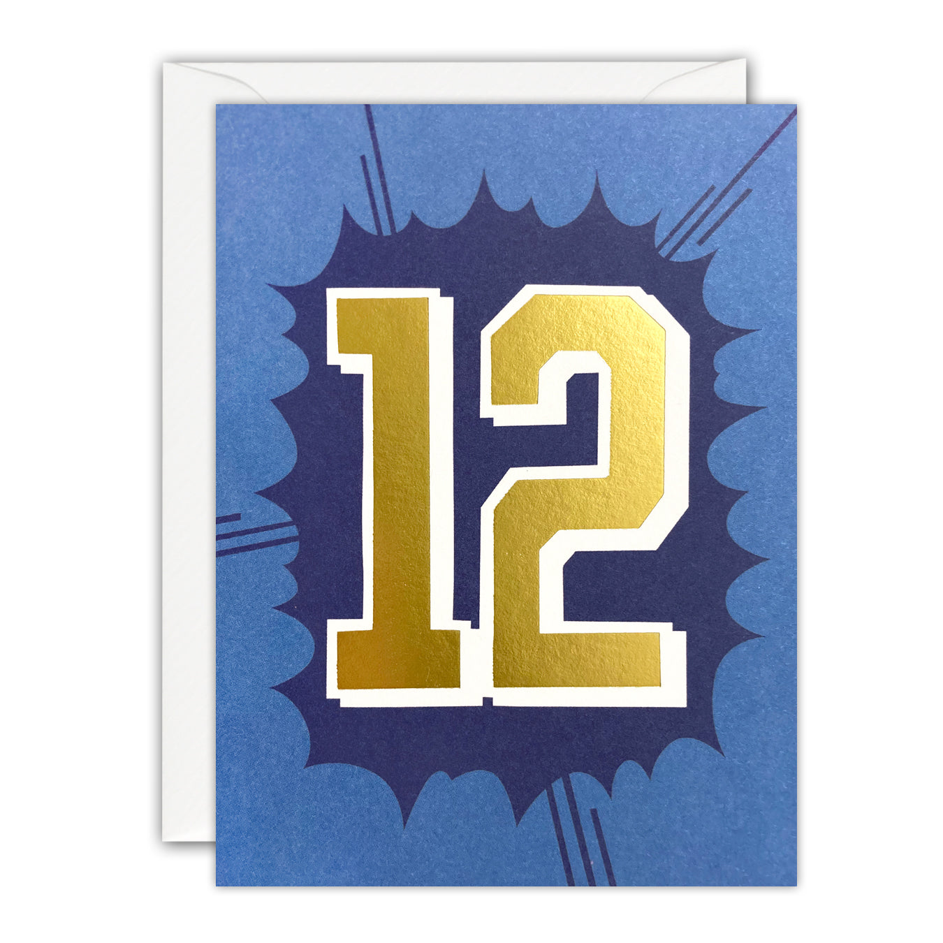 A bright and bold age twelve card designed by Nicola Watson. The image on the front of the card is illustrated in a fun pop art style, with a gold foiled number 12 on a blue background.