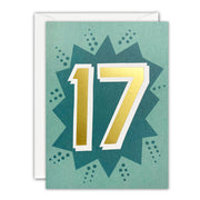 A bright and bold age seventeen card designed by Nicola Watson. The image on the front of the card is illustrated in a fun pop art style, with a gold foiled number 17 on a turquoise background.