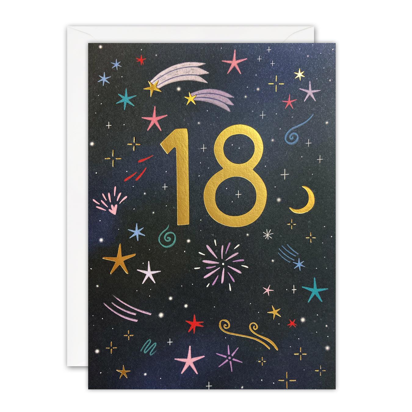 A beautiful age 18 card illustrated by Bea Müller. The image on the front of the card features a large number 18, surrounded by colourful fireworks in a dark night sky. The number and other elements within the design are foiled in gold.