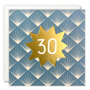 A high quality age 30 card printed with gold foil. The front of the card features a gold foiled star with the number 30 in the middle, on a patterned background inspired by art deco.