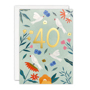 A beautiful age 40 card illustrated by Bea Müller. The image on the front of the card features a large number 40, surrounded by birds and flowers on a turquoise background. The number and other elements within the design are foiled in gold.