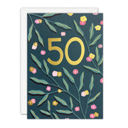A beautiful age 50 card illustrated by Bea Müller. The image on the front of the card features a large number 50, surrounded by a pattern of leaves and flowers. The number and other elements within the design are foiled in gold.