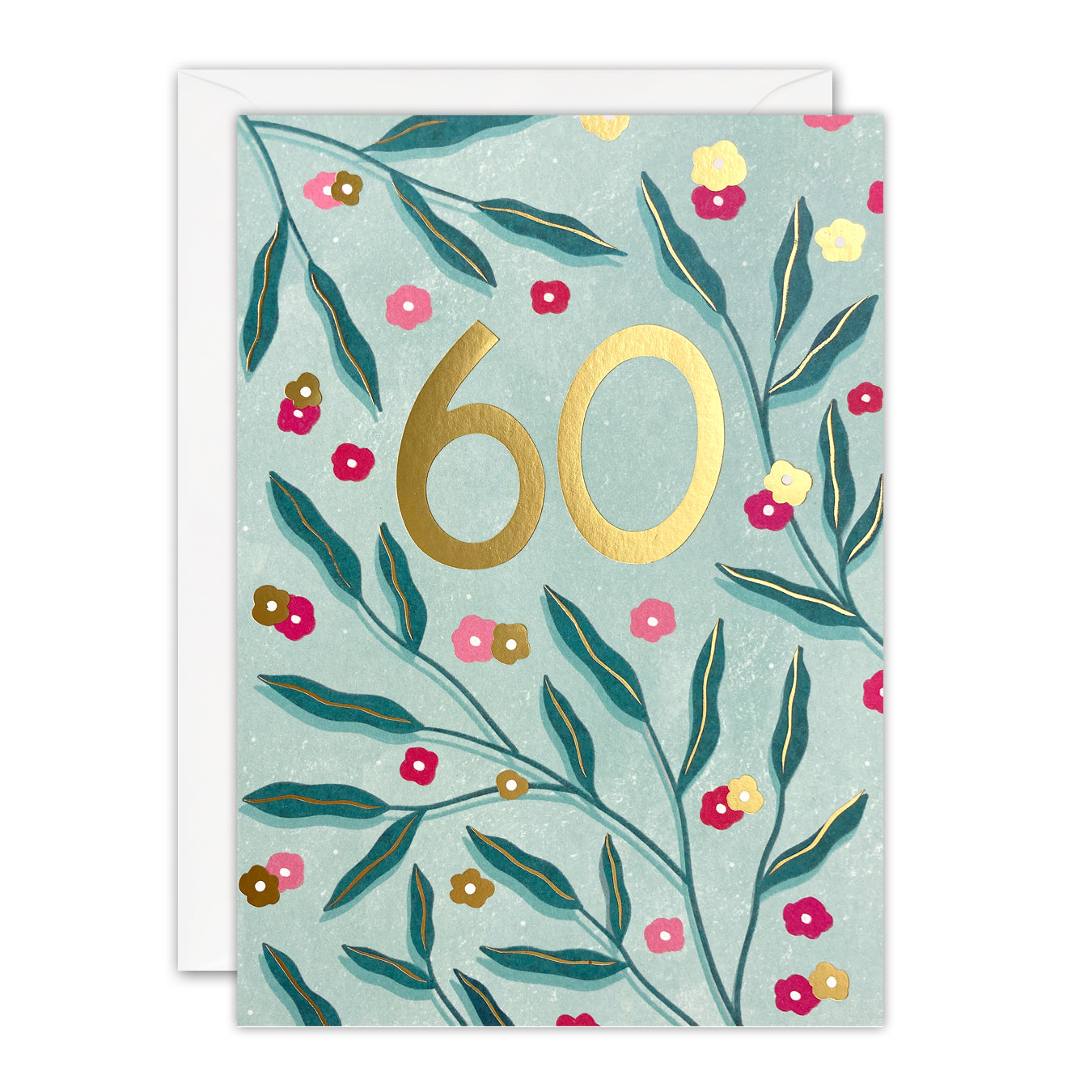 A beautiful age 60 card illustrated by Bea Müller. The image on the front of the card features a large number 60, surrounded by a pattern of leaves and flowers. The number and other elements within the design are foiled in gold.