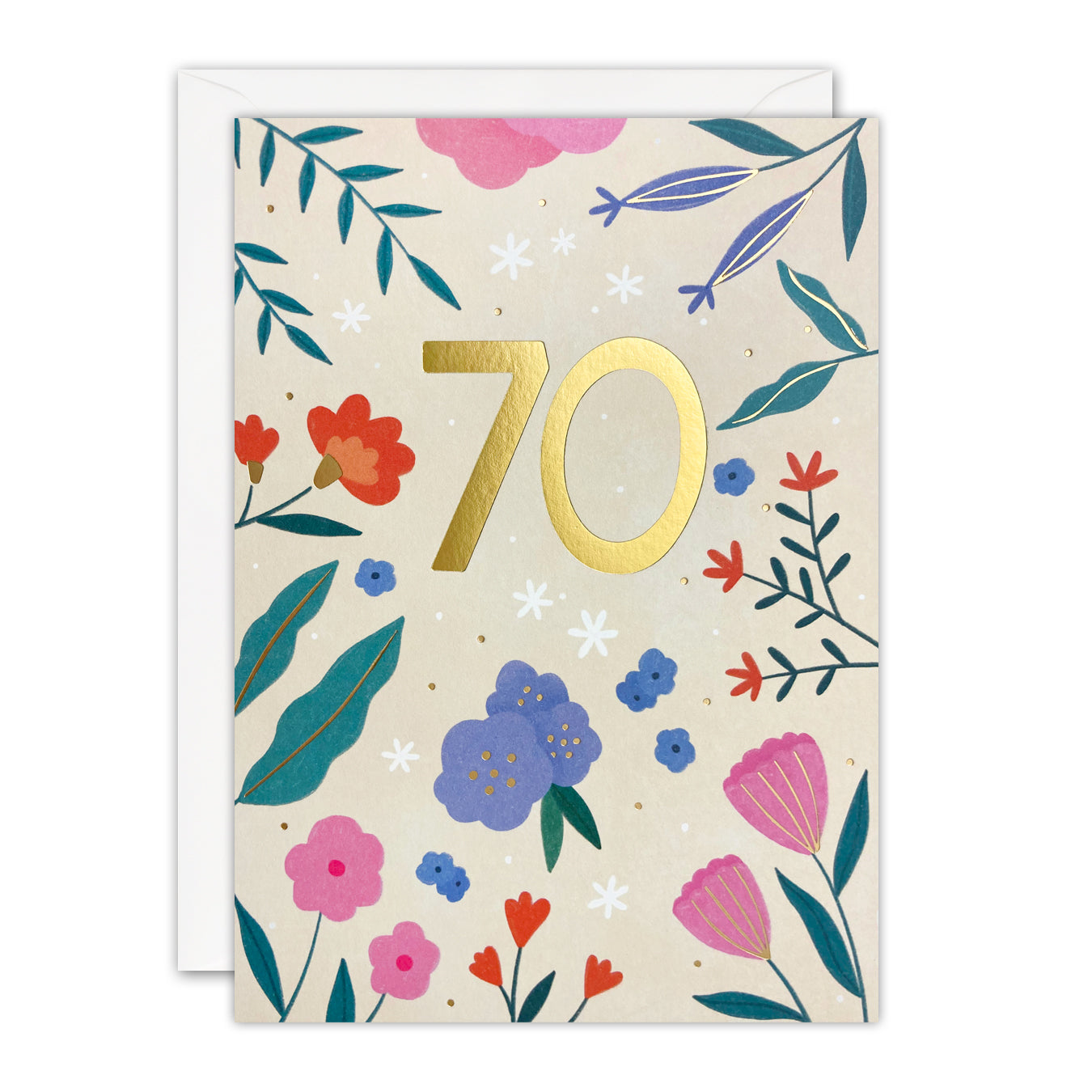 A beautiful age 70 card illustrated by Bea Müller. The image on the front of the card features a large number 70, surrounded by a colourful flowers. The number and other elements within the design are foiled in gold.