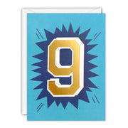 A bright and bold age nine card designed by Nicola Watson. The image on the front of the card is illustrated in a fun pop art style, with a gold foiled number 9 on a blue background.