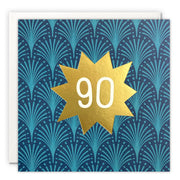 A high quality age 90 card printed with gold foil. The front of the card features a gold foiled star with the number 90 in the middle, on a patterned background inspired by art deco.