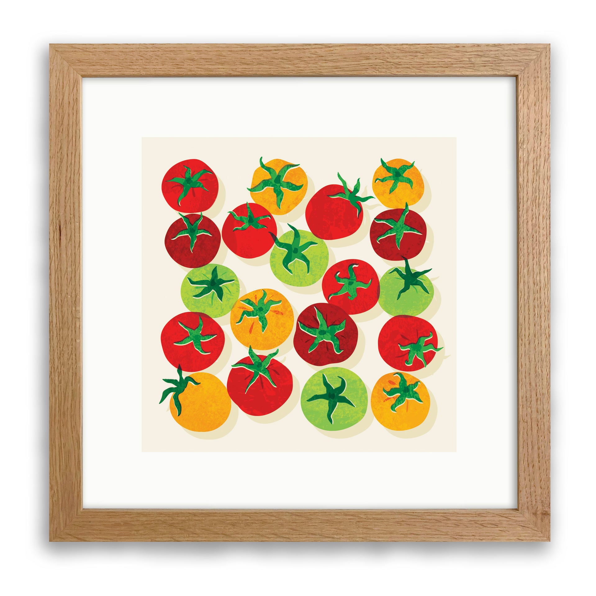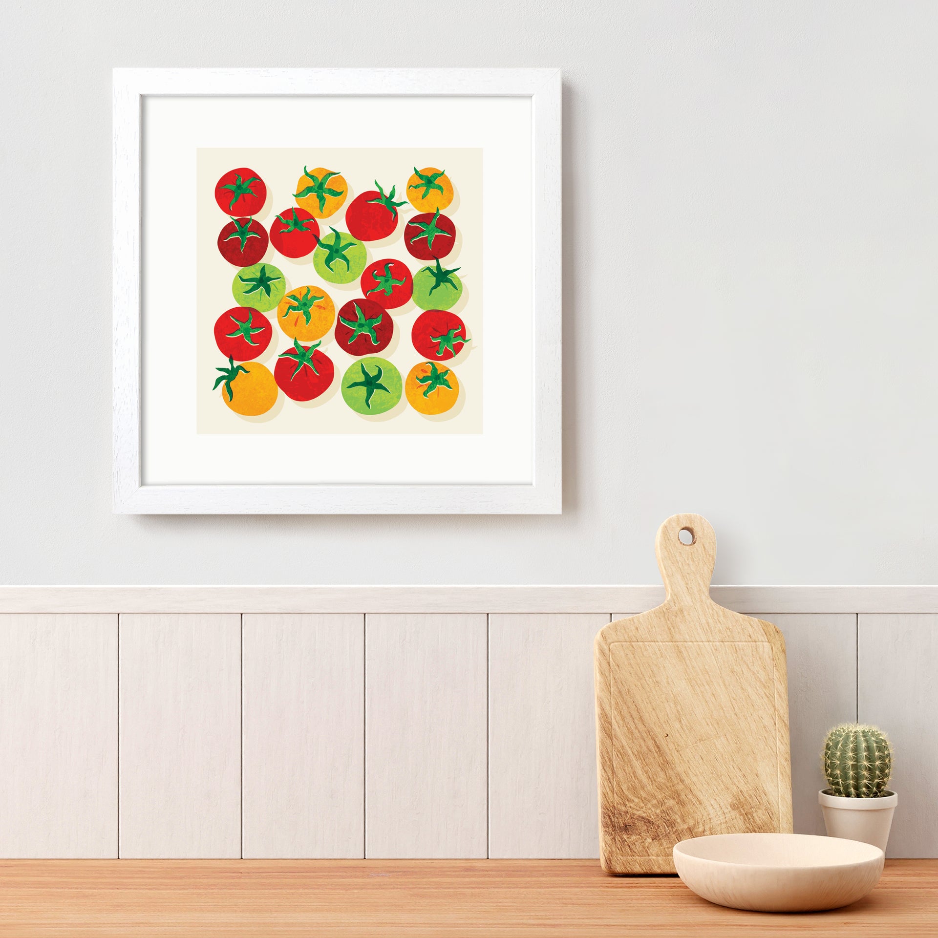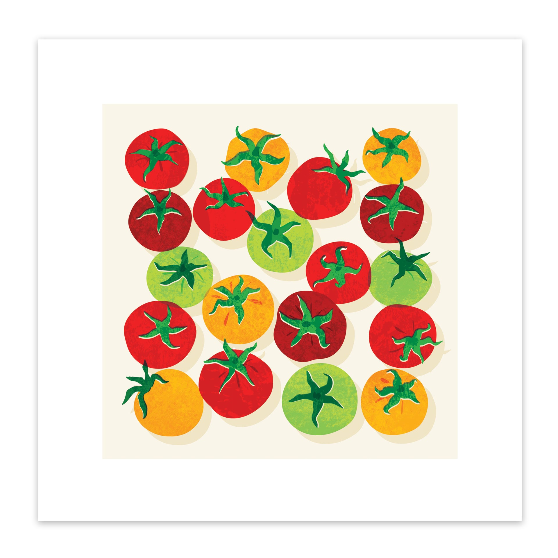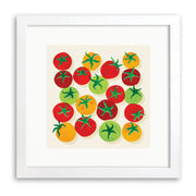 A high quality art print by Rebecca Hollingsworth titled 'Tomatoes'. The artwork depicts a collection of bright red, yellow and green tomatoes.