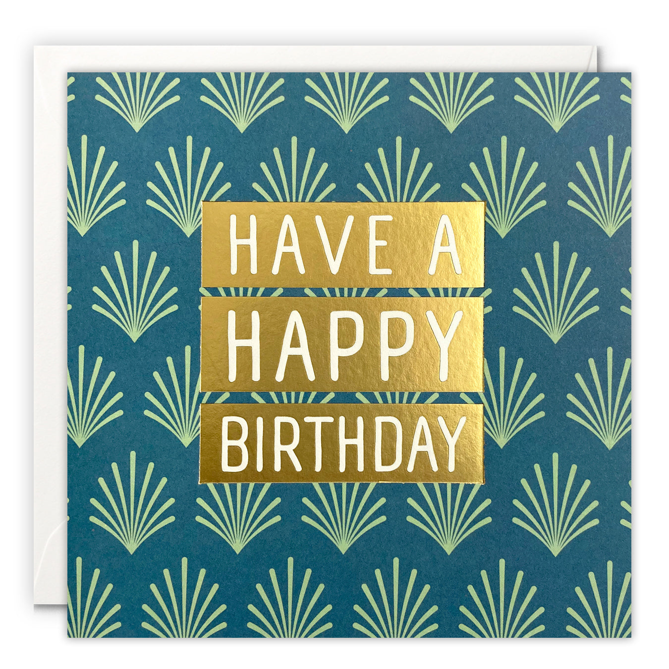 A high quality birthday card printed with gold foil. The front of the card features the words 'Have a Happy Birthday' in gold foiled blocks, on a green patterned background inspired by art deco.