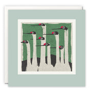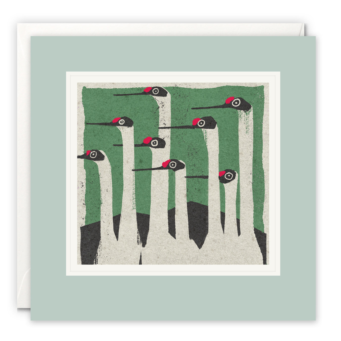 A high quality blank art card by Ophelia Pang. The artwork on the front of the card features a group of white birds with very long necks all looking in the same direction. It is titled 'One Sided'.
