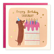 The text on the front of the card is also foiled in gold and reads 'Happy Birthday SAUSAGE!'. The card is blank inside for your own message.