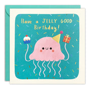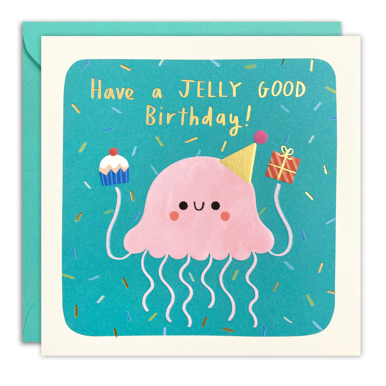 The text on the front of the card is also foiled in gold and reads 'Have a JELLY GOOD Birthday!'. The card is blank inside for your own message.