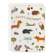 A colourful children's birthday card with rounded corners, illustrated by Linda Tordoff. The image on the front of the card features a pattern of woodland animals, insects and plants.