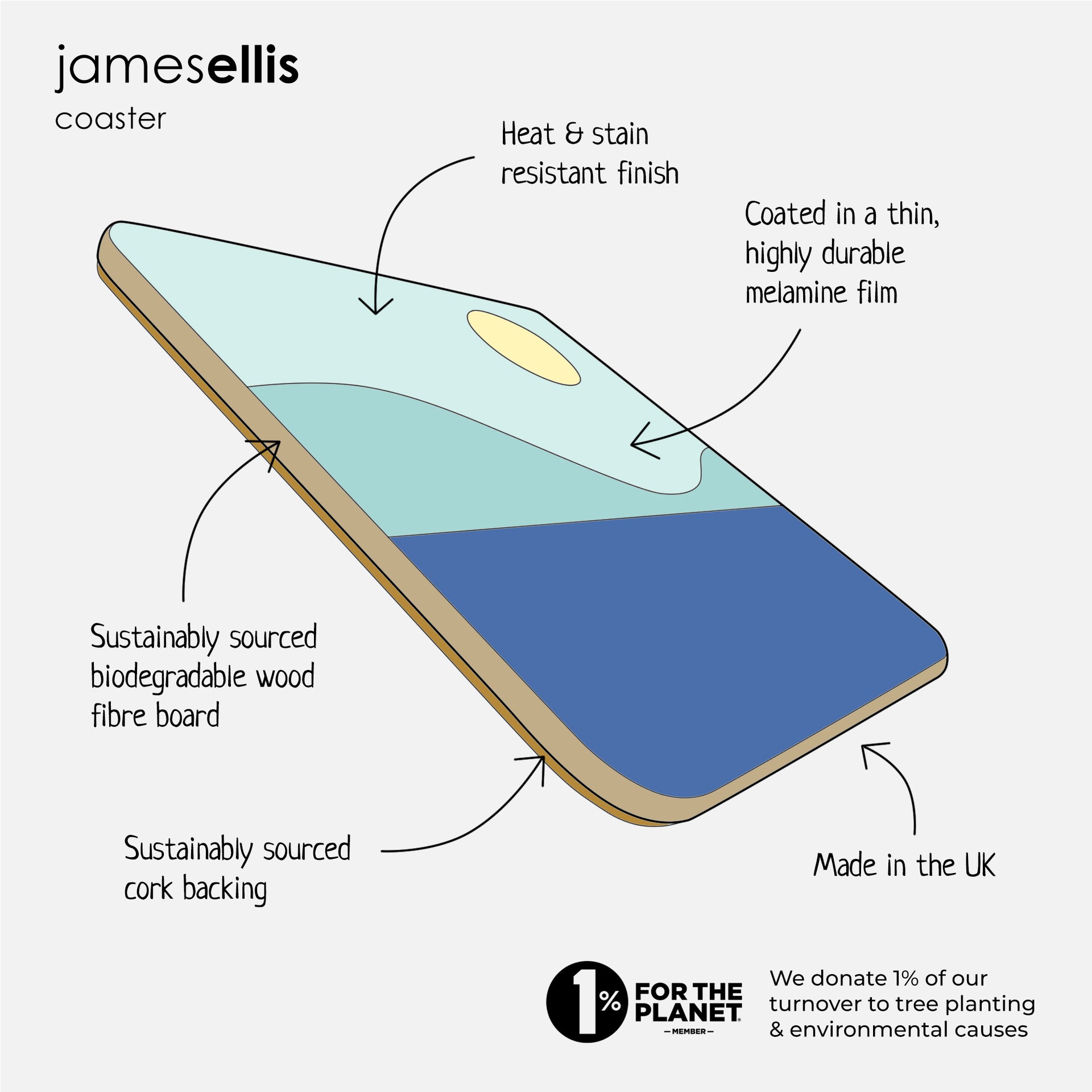 Our coasters are made in the UK using sustainably sourced wood fibre board, with a sustainably sourced cork backing. The image is coated with a thin but highly durable melamine film, which is manufactured under laboratory conditions for a heat and stain resistant finish.