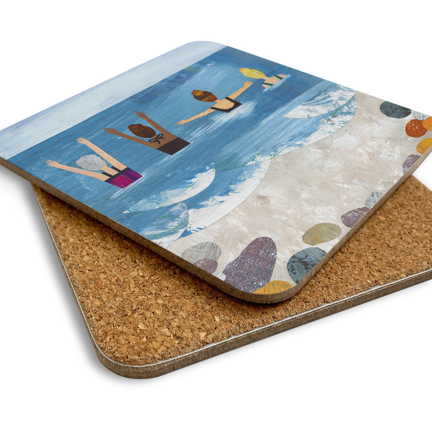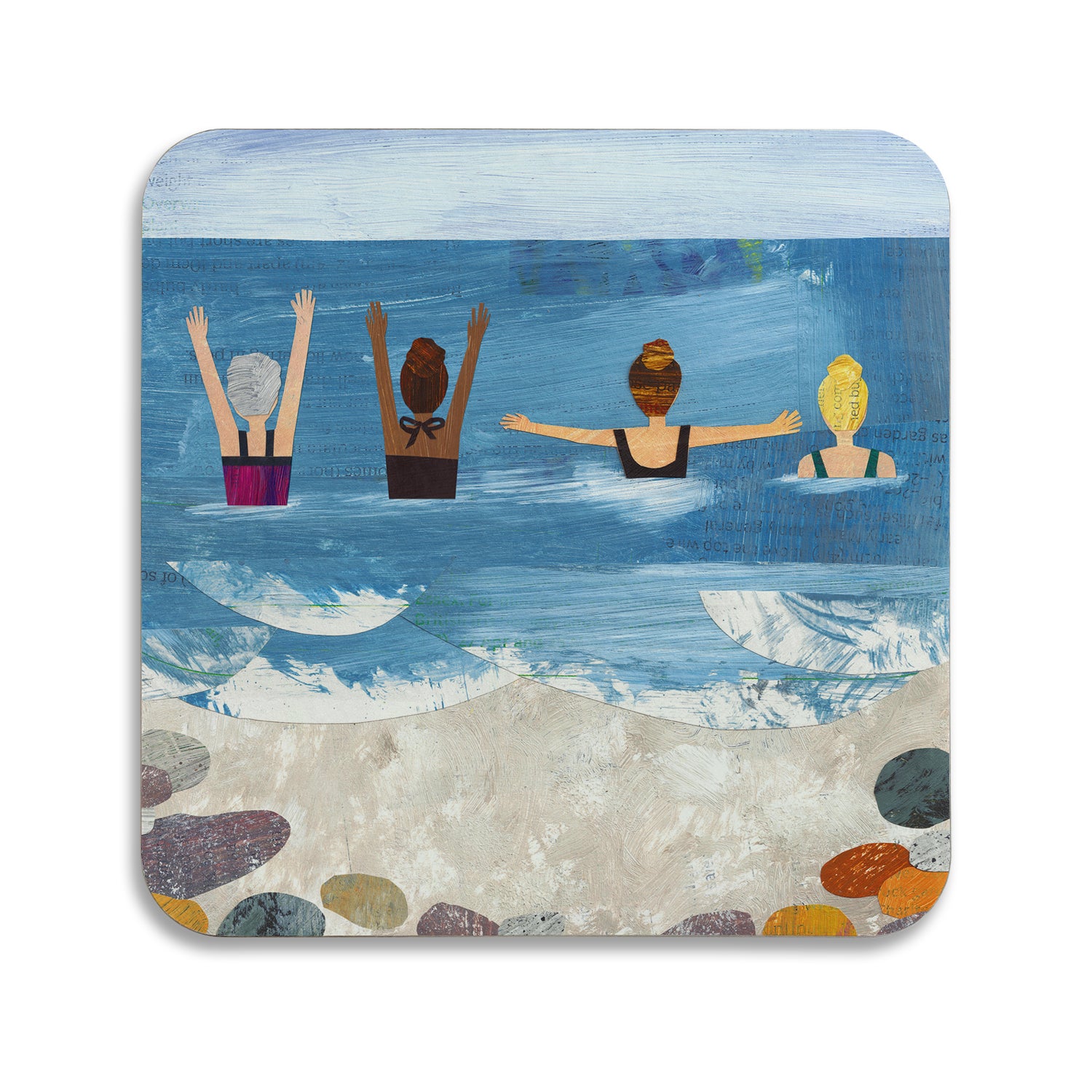 A high quality coaster featuring artwork by Christina Carpenter. The image depicts four women wading into the sea.