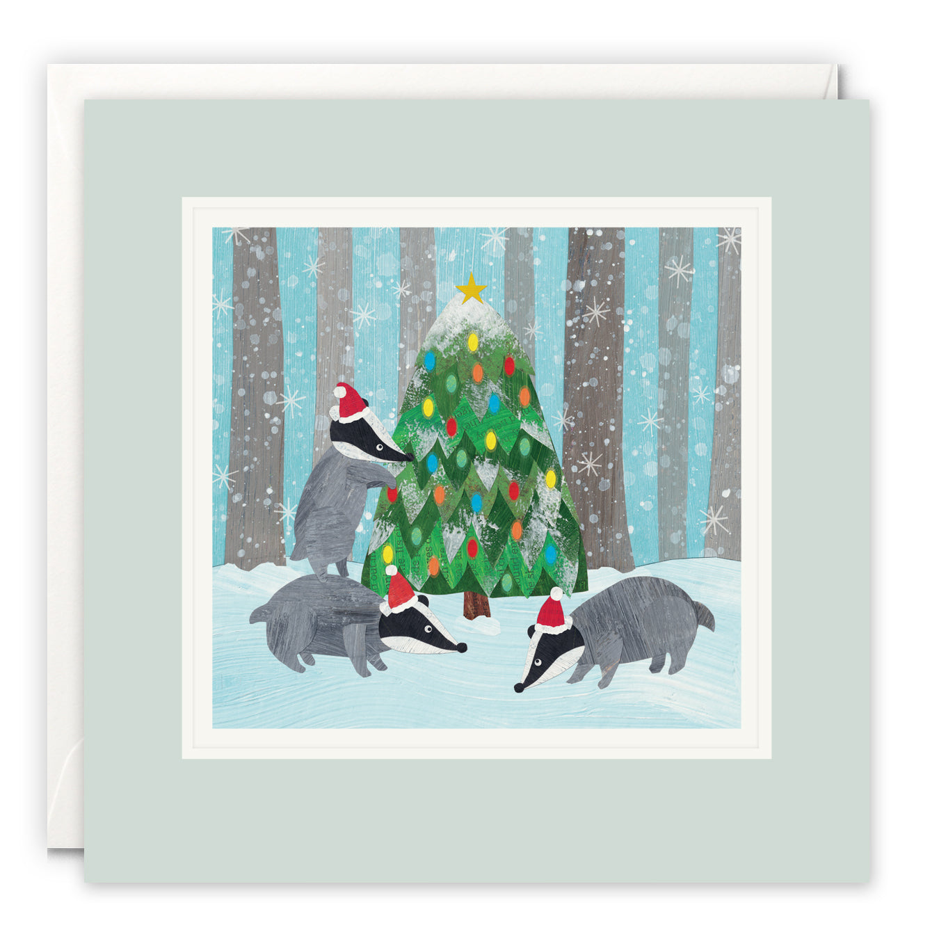 A high quality blank art card for Christmas by Christina Carpenter. The artwork on the front of the card features three badgers wearing Christmas hats, decorating a Christmas Tree in the snow. It is titled 'Christmas Badgers'.