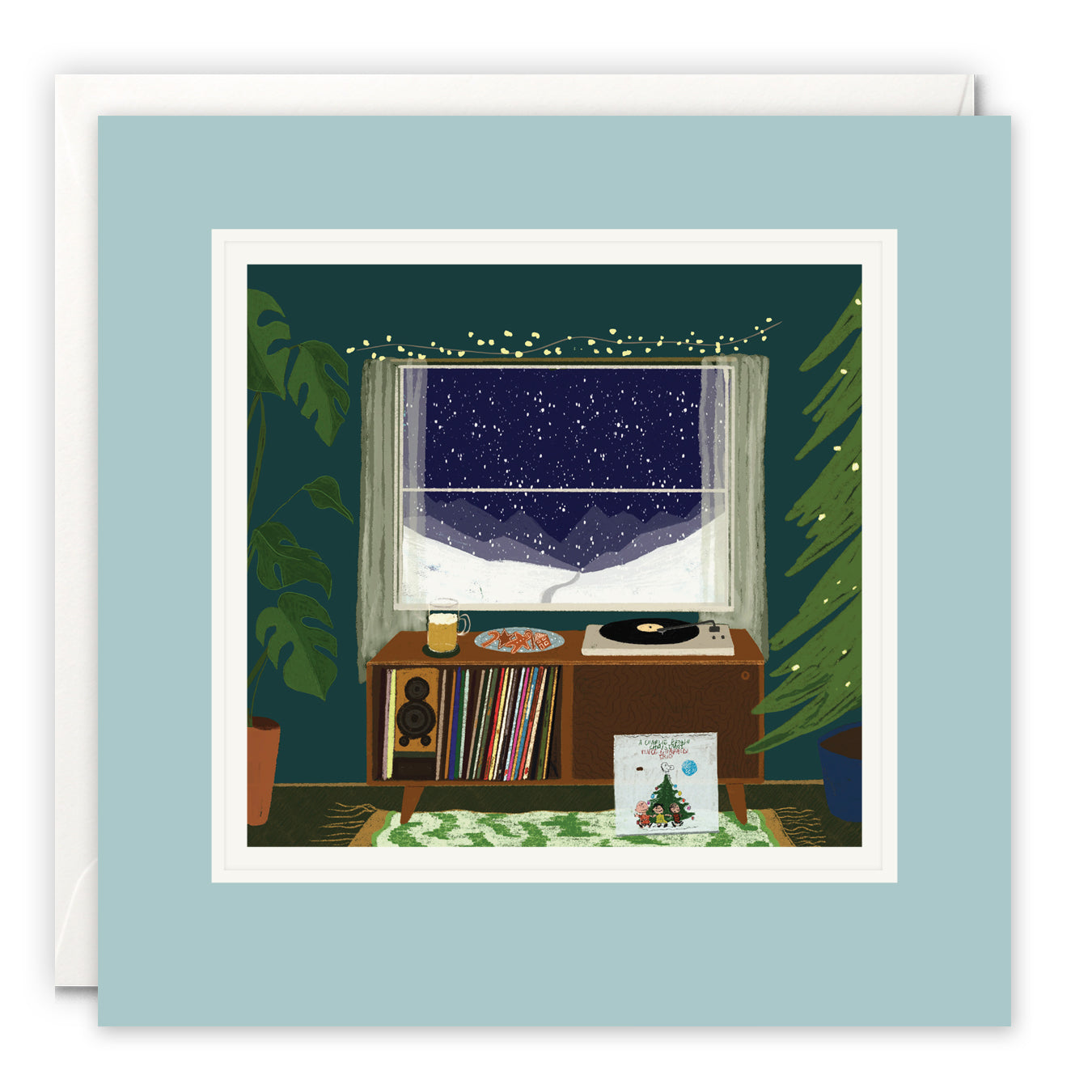 A high quality blank art card for Christmas by Charis Raine. The artwork on the front of the card features a cosy, festive room with a record player below a window looking out onto the snow. It is titled 'Christmas Records'.