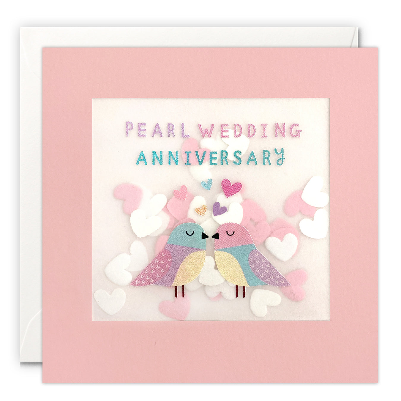A hand finished pearl anniversary card illustrated by Sally Payne. The image on the front features two cute birds facing each other, with little hearts above. The message on the front reads 'Pearl Wedding Anniversary'.