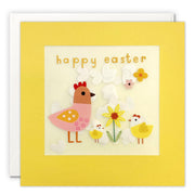 A hand finished Easter card illustrated by Sally Payne. The image on the front features a chicken, a little chick and flowers.