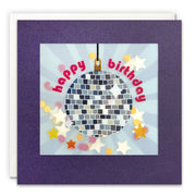 A hand finished birthday card illustrated by Holly Maguire. The image on the front features a disco ball surrounded by stars.