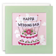 A hand finished wedding card illustrated by Jacqui Lee. The image on the front features a white and pink wedding cake, with a banner on top which reads 'Happy Wedding Day'.