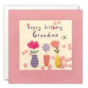 A hand finished birthday card for a Grandma, illustrated by Kate Mainard. The image on the front features three flowers in colourful vases.