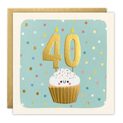 A fun 40th birthday card illustrated by Alice Mole. The image on the front of the card features a happy cupcake with two large gold candles in the shape of the number 40.