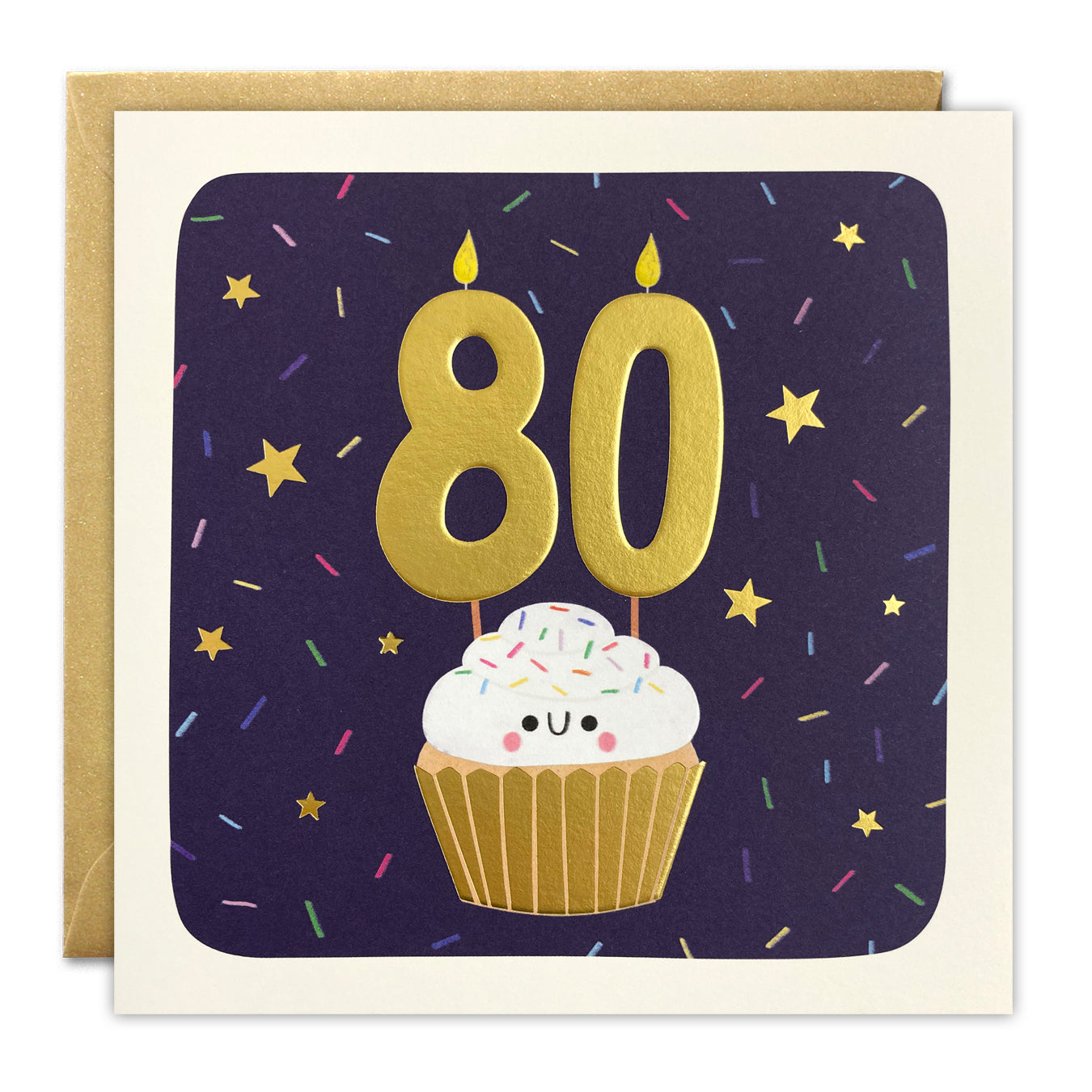 A fun 80th birthday card illustrated by Alice Mole. The image on the front of the card features a happy cupcake with two large gold candles in the shape of the number 80.