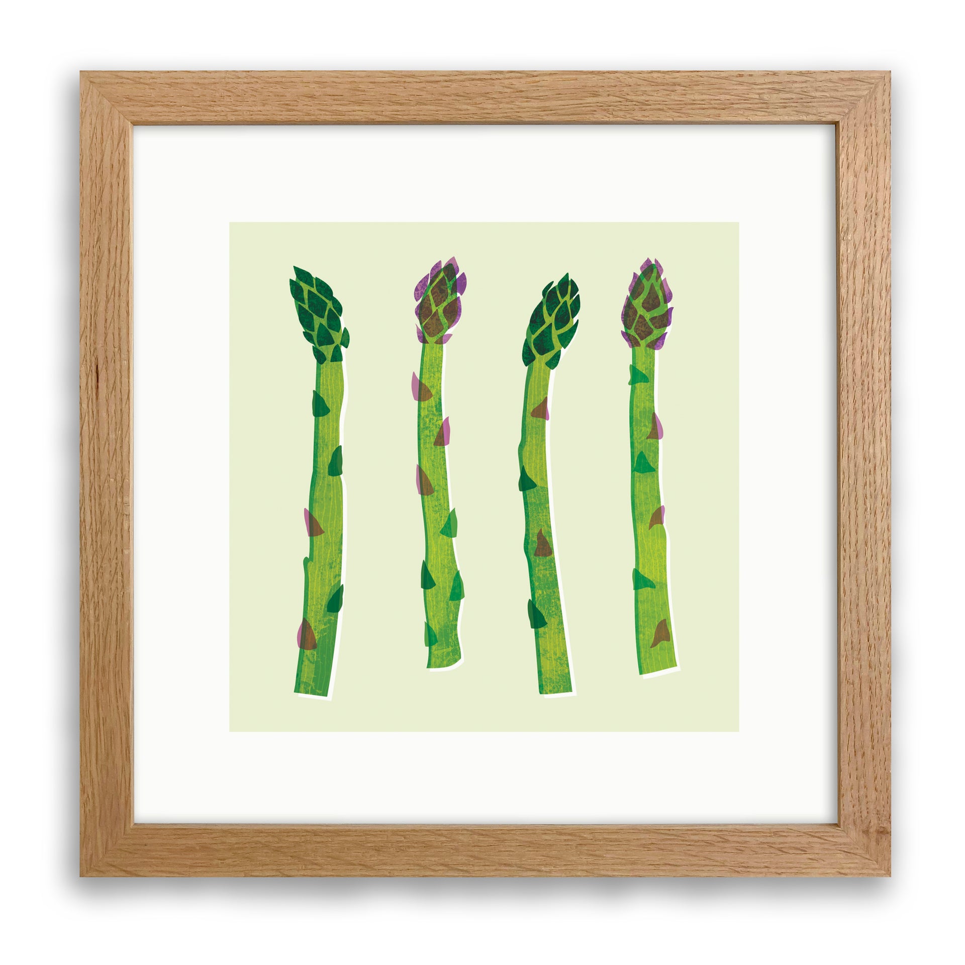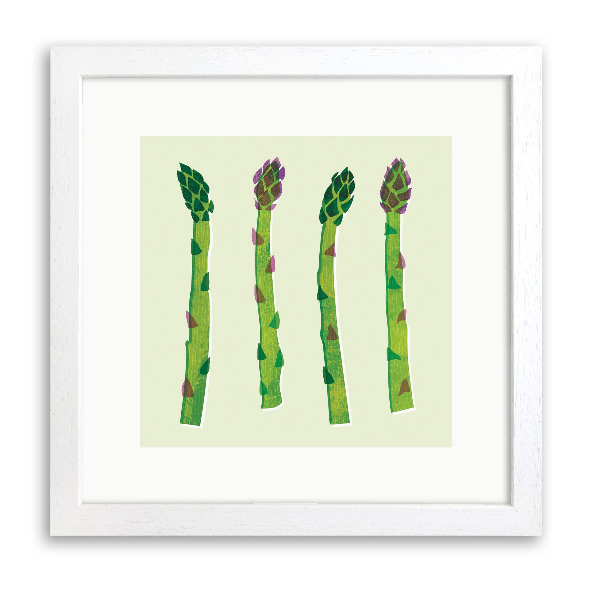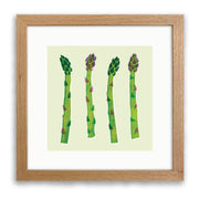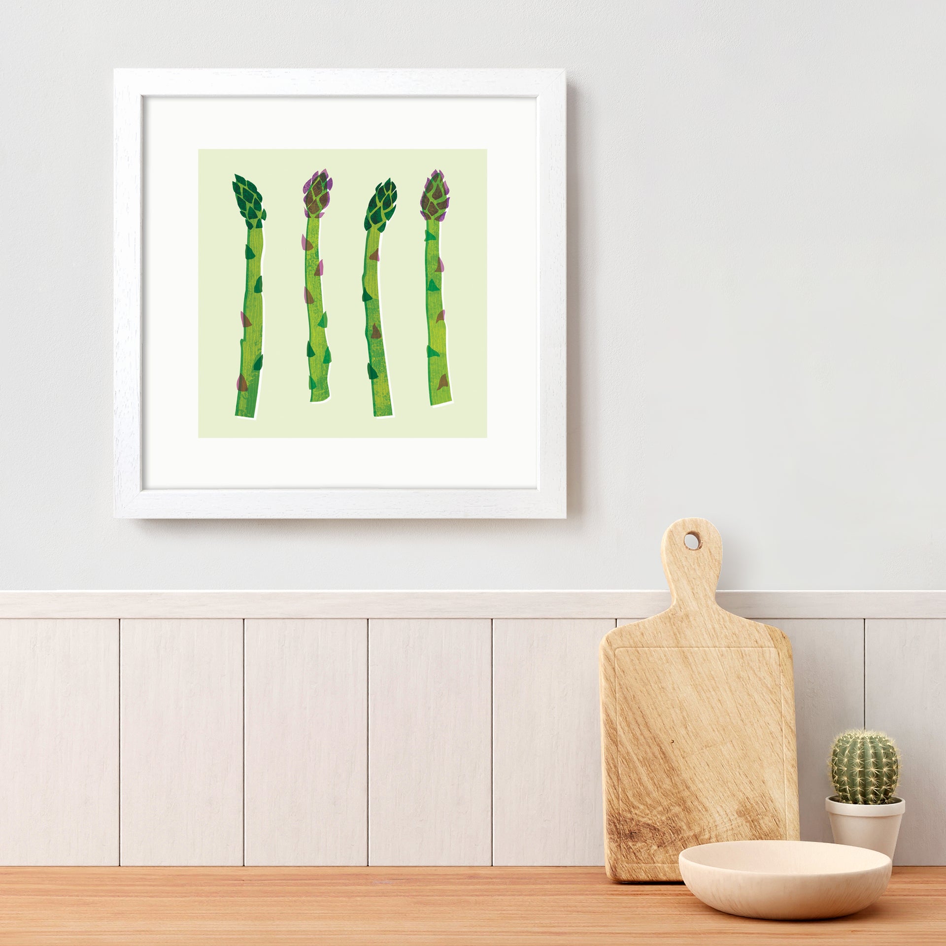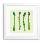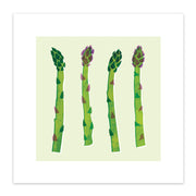 A high quality art print by Rebecca Hollingsworth titled 'Asparagus'. The artwork depicts four vibrant asparagus stalks on a tranquil green background.