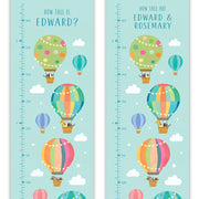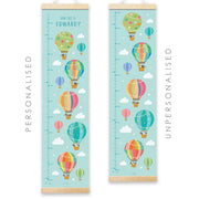 A colourful hot air balloon height chart with wooden hangers, illustrated by Linda Tordoff.