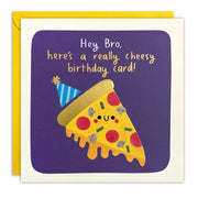 A fun birthday card for a brother, illustrated by Alice Mole. The image on the front of the card features a slice of cheesy pizza wearing a party hat. The pizza is embossed and details within the image are foiled in gold.