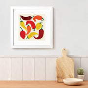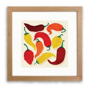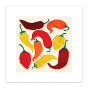 A high quality art print by Rebecca Hollingsworth titled 'Chillies'. The artwork depicts a selection of hot chilli peppers in rich reds, oranges and yellows.