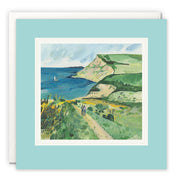 A high quality blank art card by Miranda Sofroniou. The artwork on the front of the card features a coastal view with a couple walking towards the sea. It is titled 'Days Like These'.