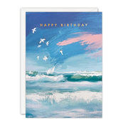 A high quality birthday card featuring artwork by Gill Wild. The image on the front of the card shows a group of gannets diving into a rough sea with a dramatic blue and pink sky.