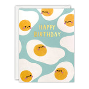 A fun birthday card illustrated by Alice Mole. The image on the front of the card features a pattern of happy fried eggs on a blue background.