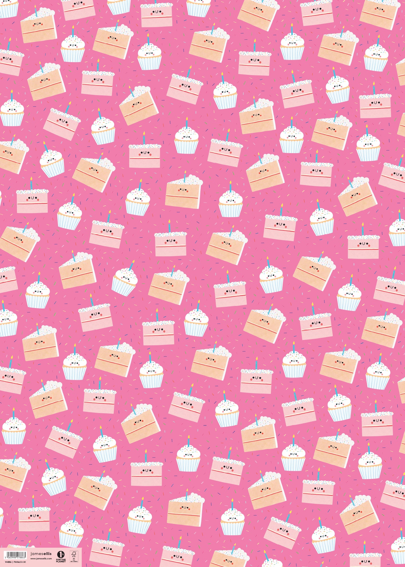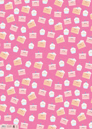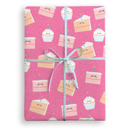 A sheet of high quality wrapping paper illustrated by Alice Mole. The pattern features a variety of happy cakes, each decorated with a candle, on a pink background.