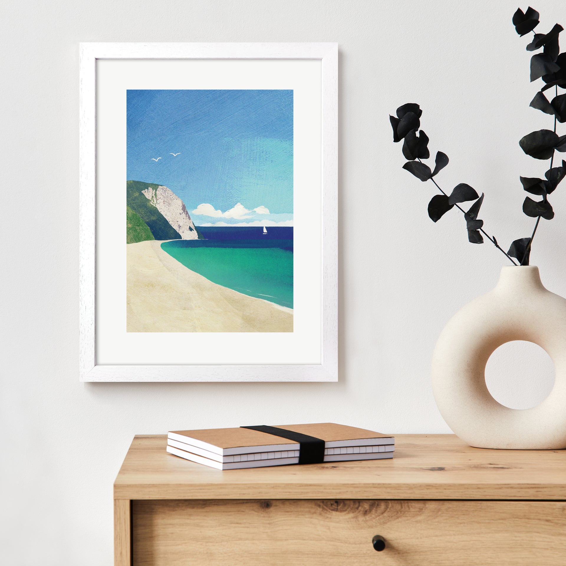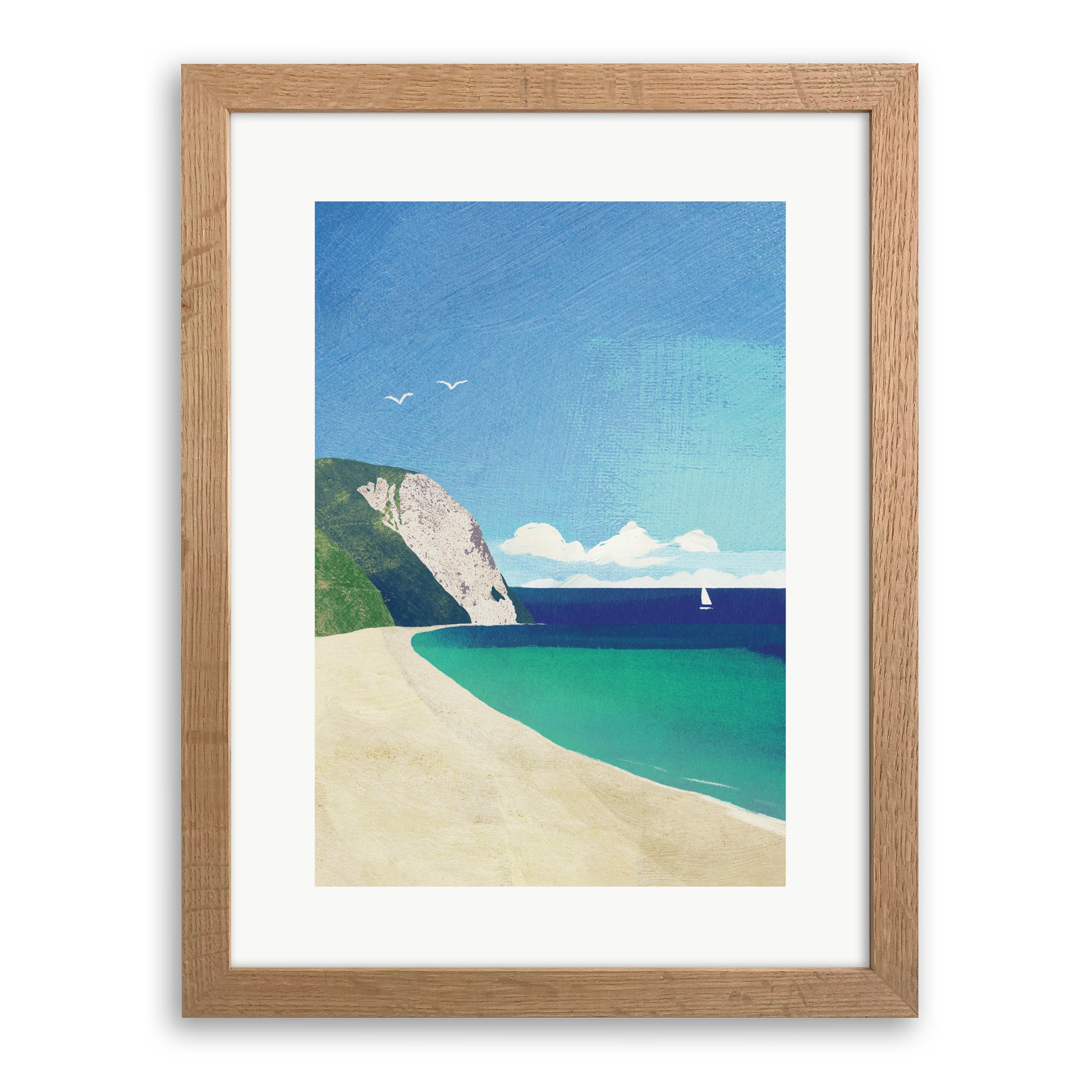 A high quality art print by Henry Rivers titled 'Sandy Beach'. The artwork depicts a wide sandy beach with white cliffs and a sailing boat on the horizon.