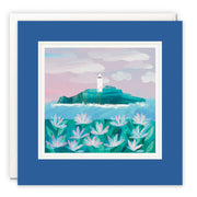 A high quality blank art card by Gill Wild. The artwork on the front of the card features a view across the sea to a white lighthouse, with pink wild flowers in the foreground. It is titled 'Seapinks at Godrevy'.