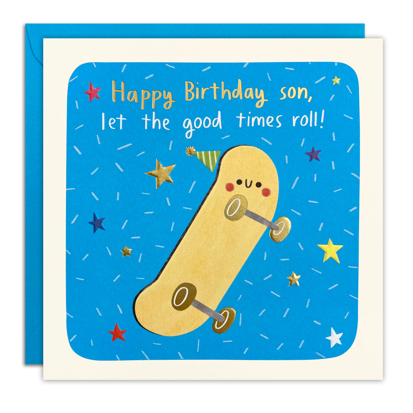 A fun birthday card for a son, illustrated by Alice Mole. The image on the front of the card features a happy skateboard with a party hat, surrounded by coloured stars. The main features of the image are embossed and details are foiled in gold.