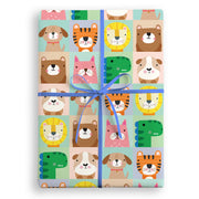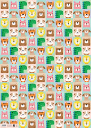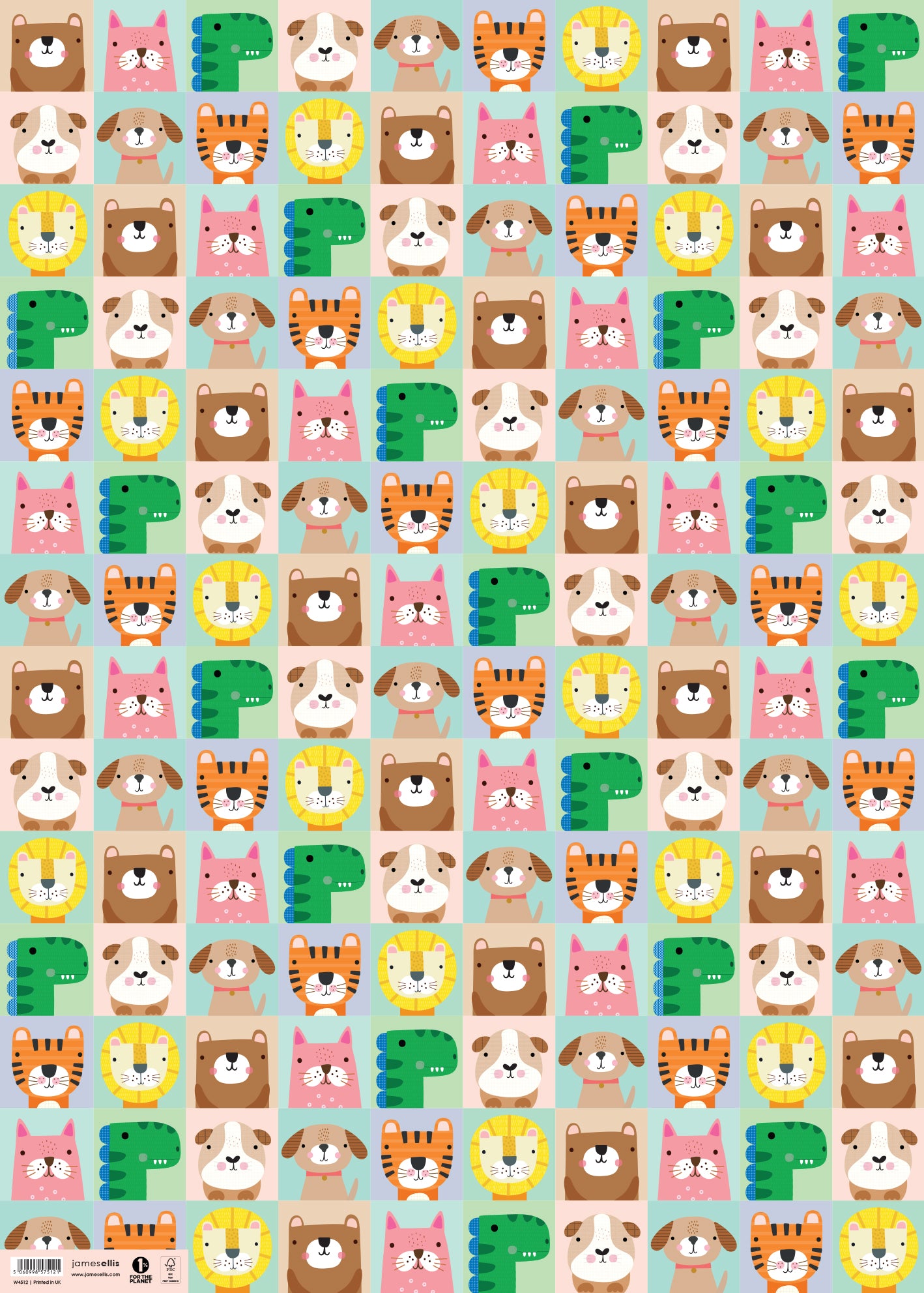 A sheet of high quality wrapping paper illustrated by Sally Payne. The pattern features cute and colourful animal faces, including a dog, cat, tiger, lion, bear, dinosaur and guinea pig.