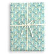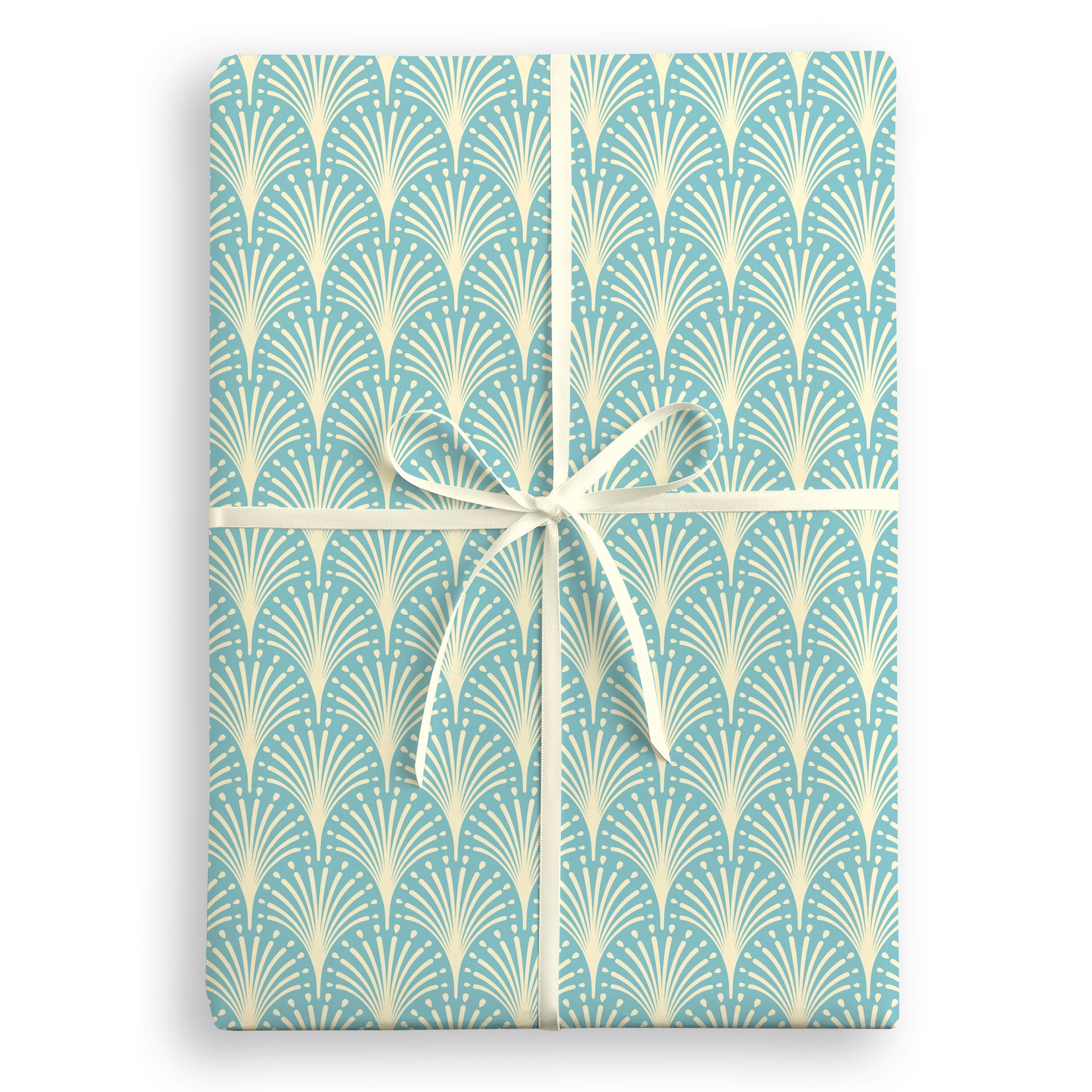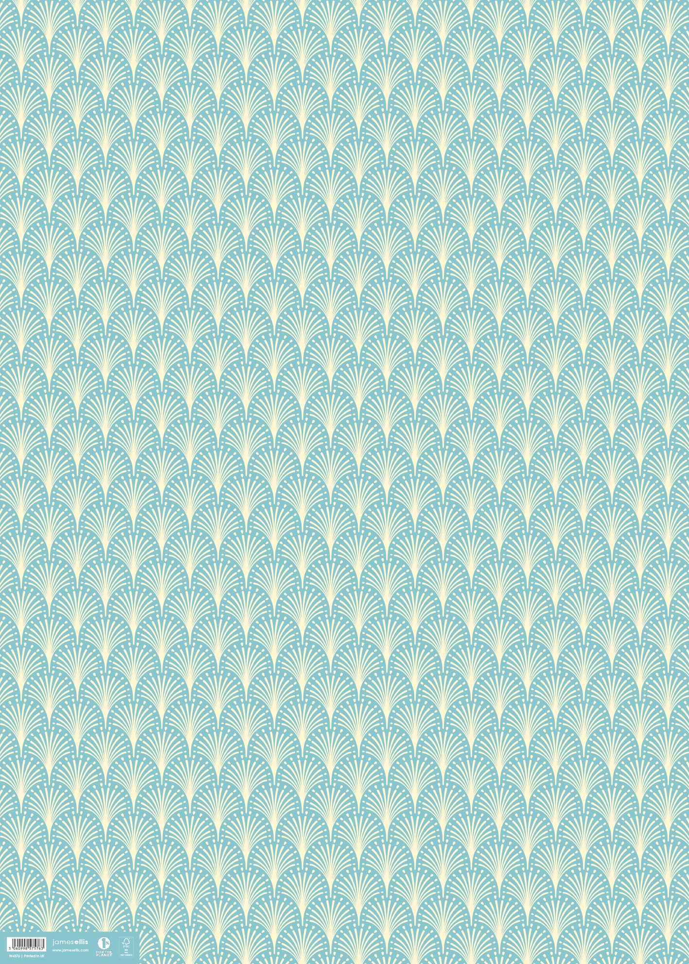 A sheet of high quality wrapping paper with a beautiful blue and cream pattern inspired by Art Deco.
