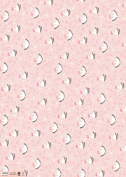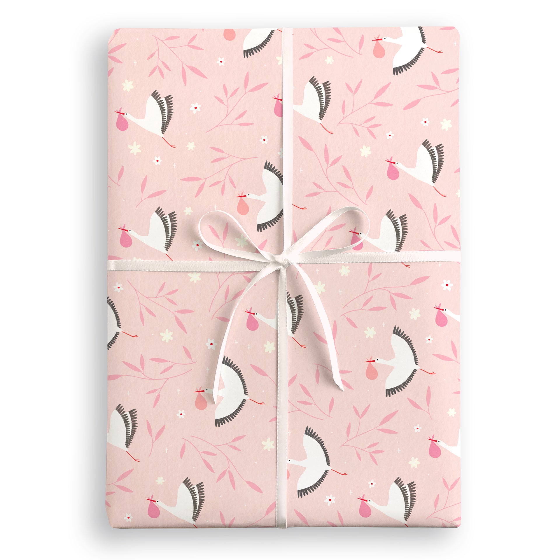 A sheet of high quality new baby wrapping paper illustrated by Bea Müller. The pattern features storks holding pink bundles, surrounded by leaves and flowers, on a pink background.