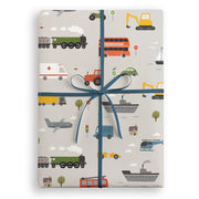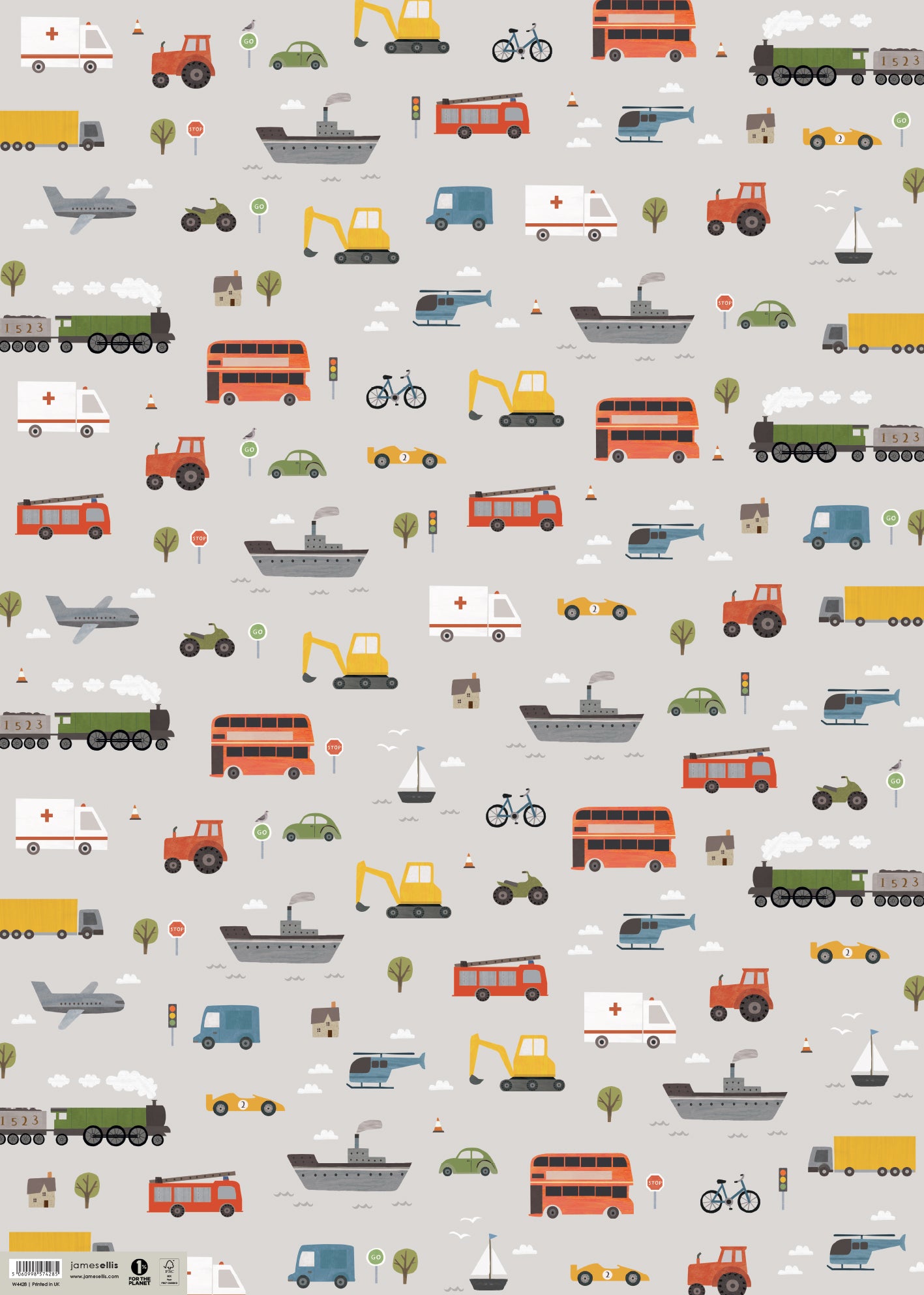 A sheet of high quality wrapping paper illustrated by Linda Tordoff. The pattern features a collection of transport vehicles including a red bus, a yellow digger and a green train.