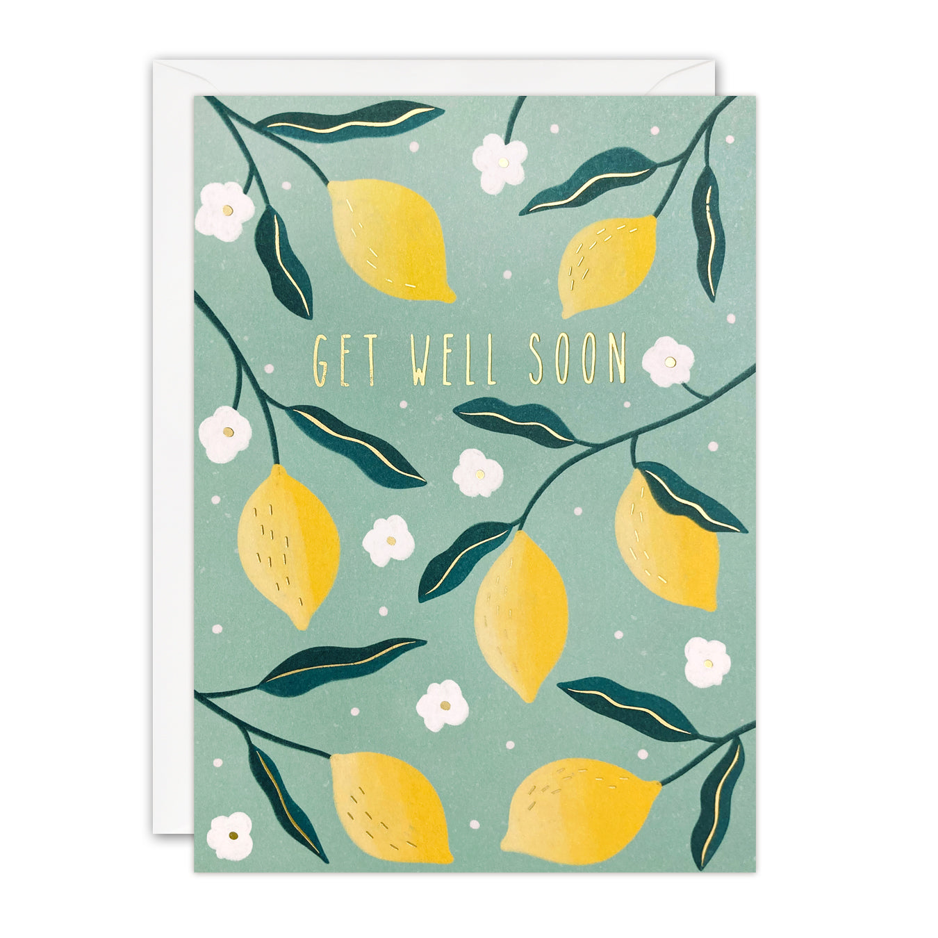 A beautiful get well soon card illustrated by Bea Müller. The image on the front of the card features a pattern of lemons, leaves and little white flowers on a turquoise background. Elements within the design are foiled in gold.