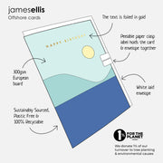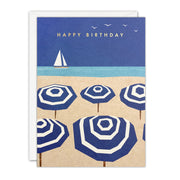 A high quality birthday card featuring artwork by Henry Rivers. The image on the front of the card shows rows of blue and white parasols on a sandy beach, with a sailing boat on the horizon.