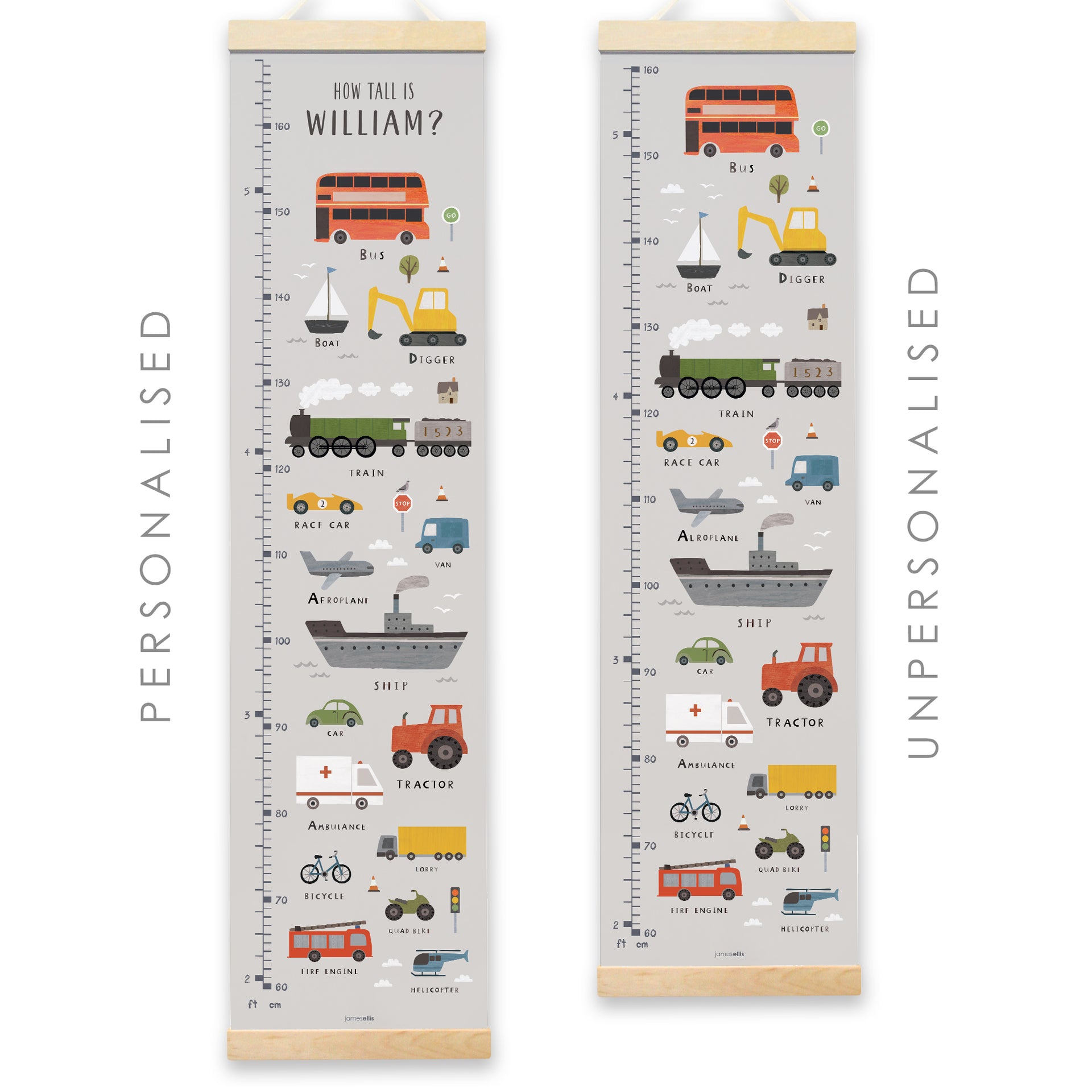 A fun transport themed height chart, illustrated by Linda Tordoff.