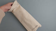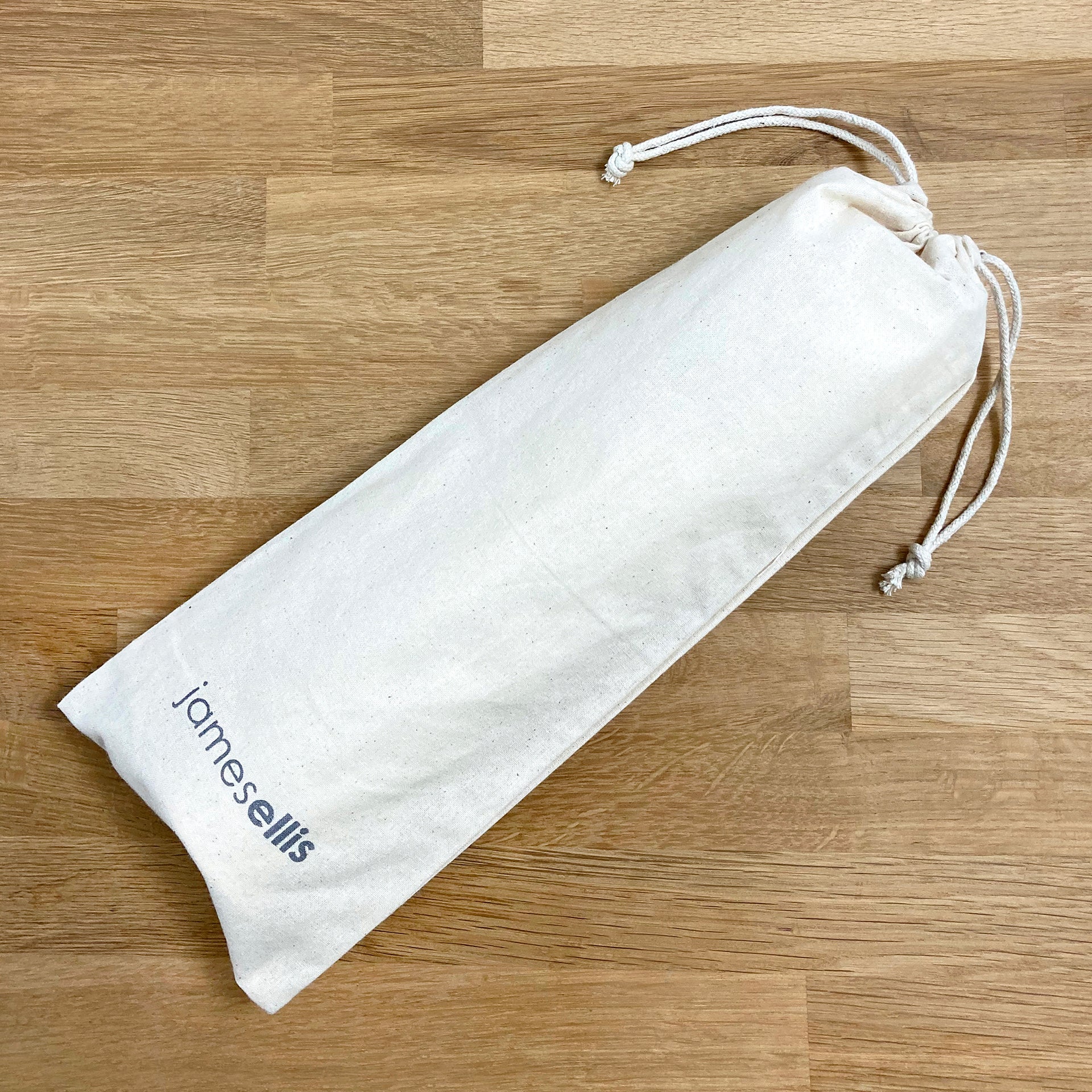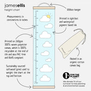 Height Chart: canvas, pine wood, fabric ribbon, nails (The nails are positioned in the back of the pine wood hangers to hold them together). Drawstring Bag: organic cotton